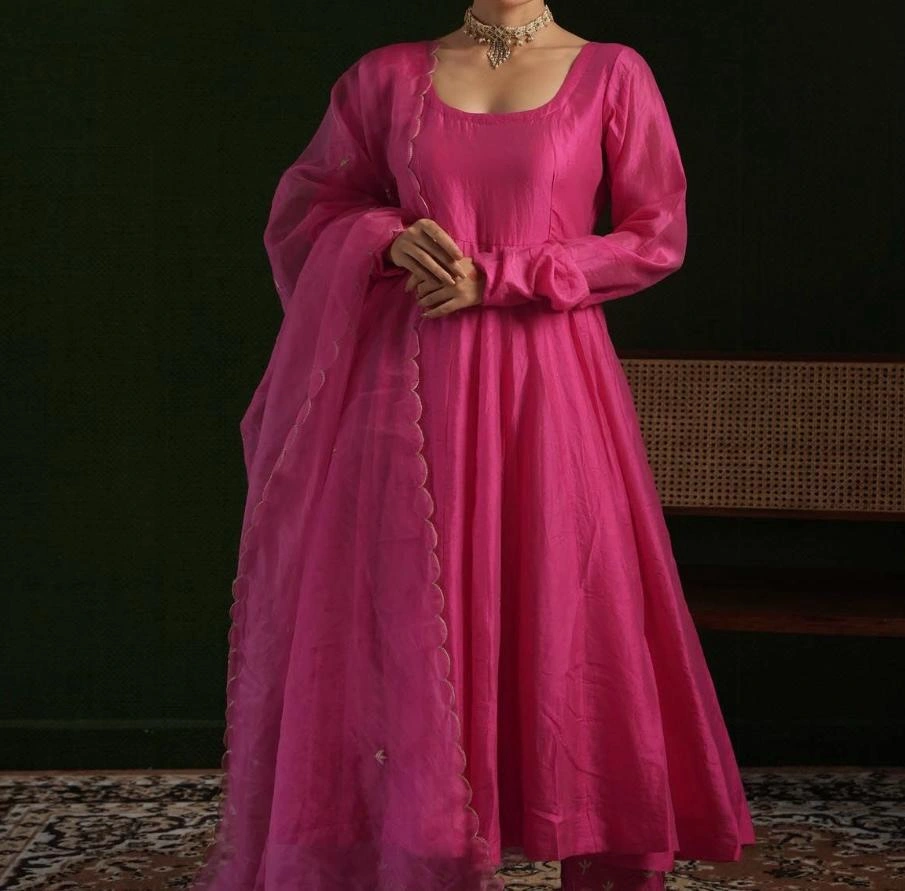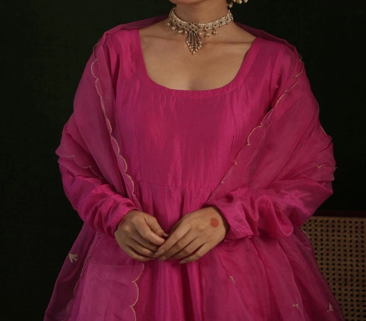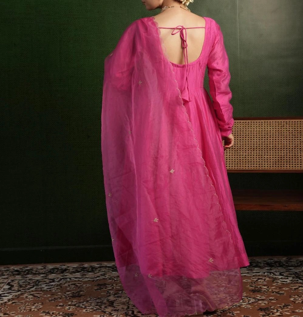 Step into effortless grace with this vibrant fuchsia pink Chanderi Anarkali set, designed to blend traditional charm with modern finesse. From its elegant silhouette to the delicate back tie-up, every detail adds a regal touch.