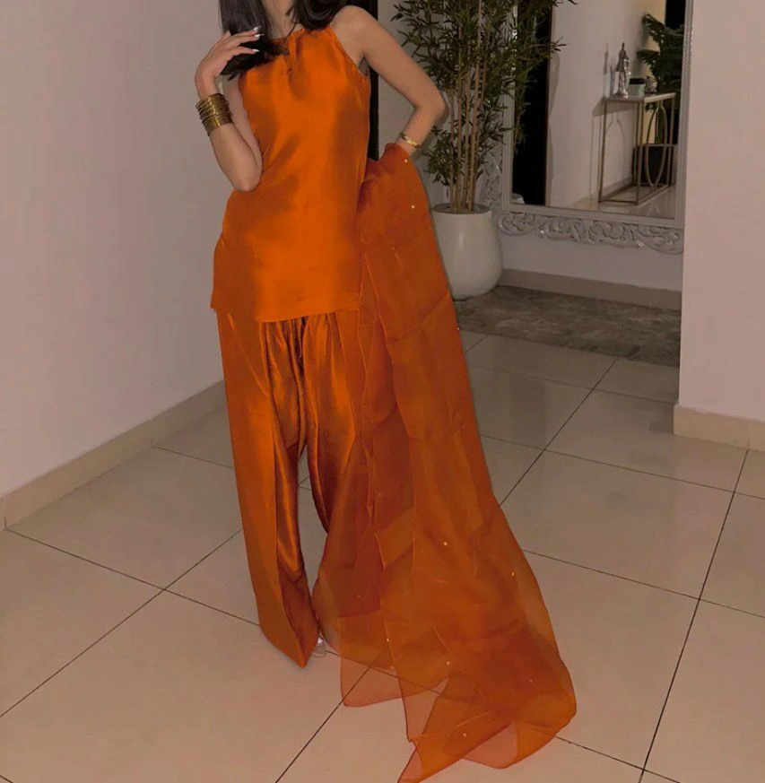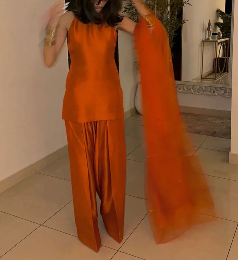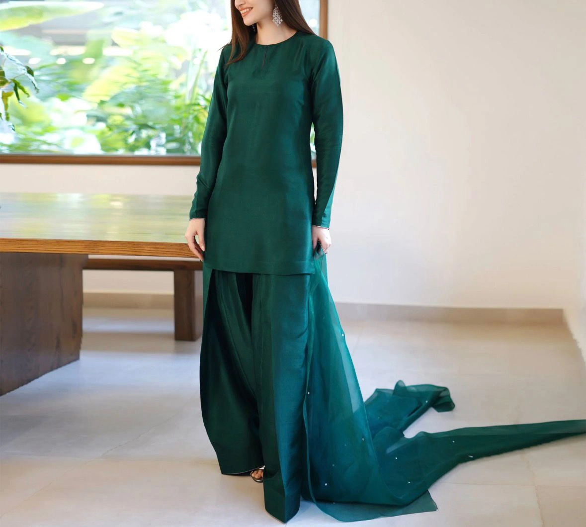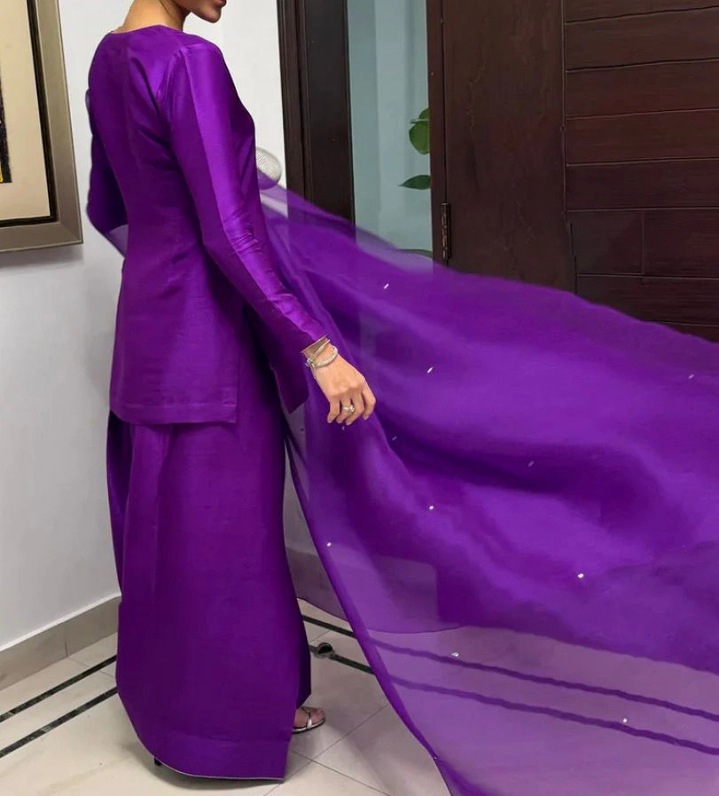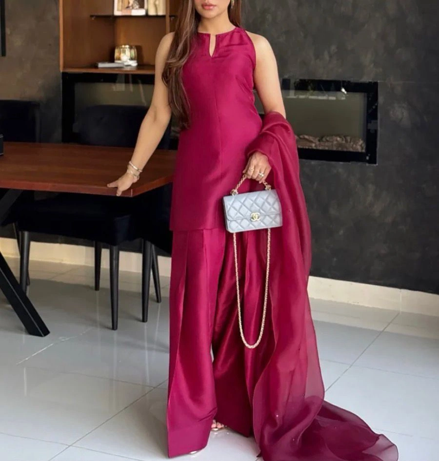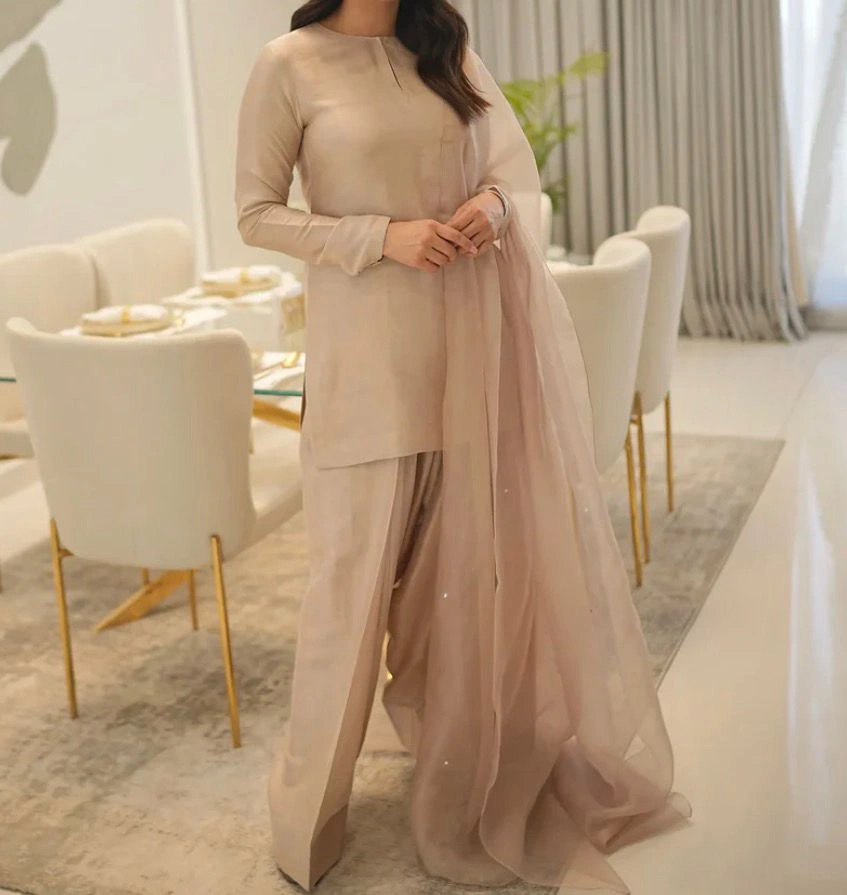 A statement of effortless elegance, this farshi set is designed for the modern muse who loves clean silhouettes with a hint of glam. Crafted in luxurious silk, the outfit features a sleek, straight-cut kameez with a minimal slit neckline, giving it a refined and contemporary look.