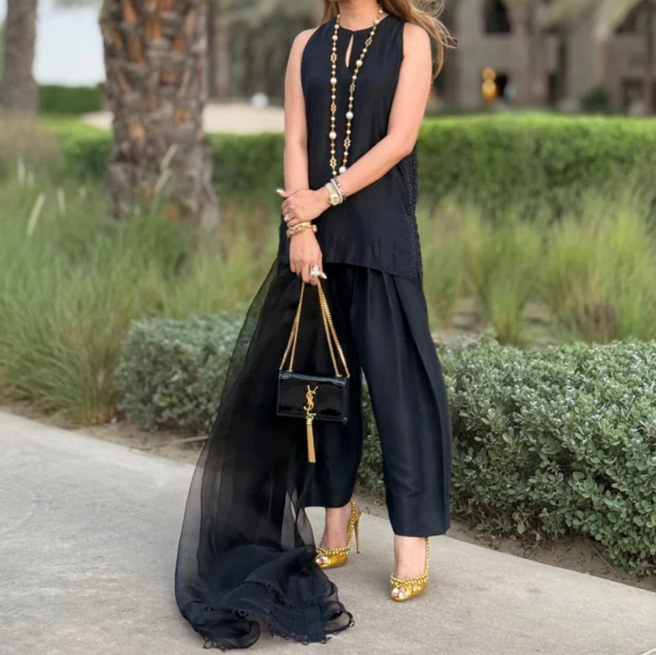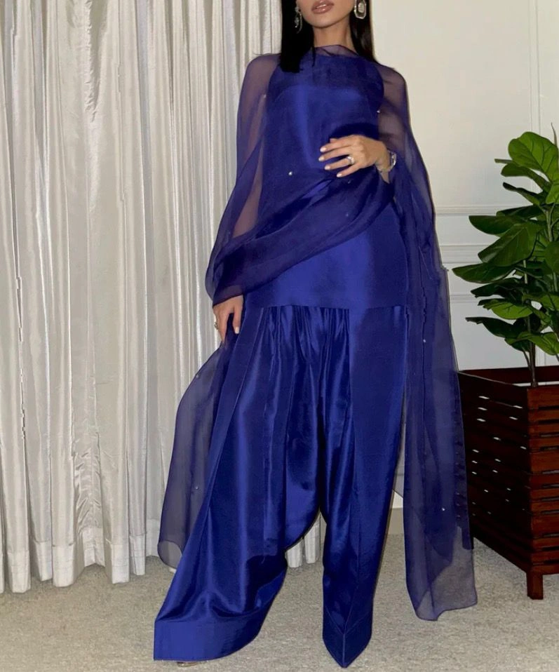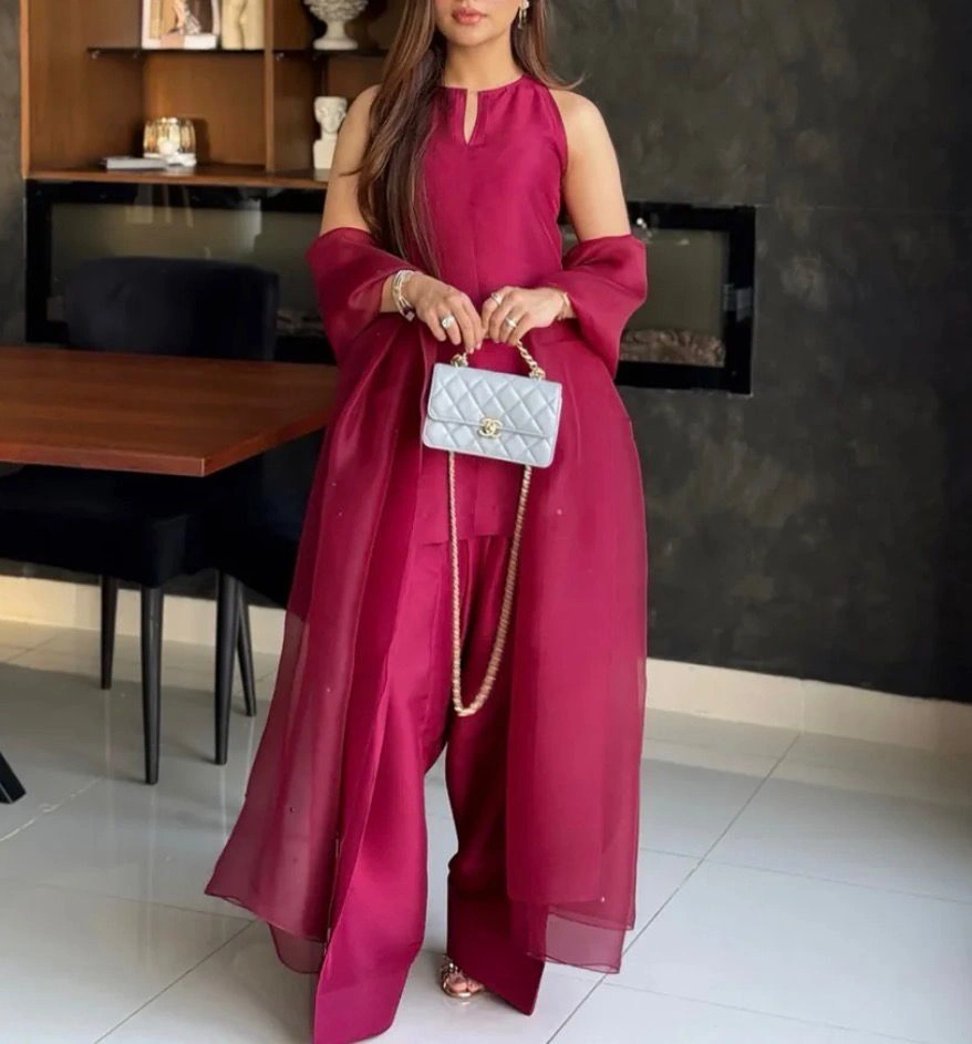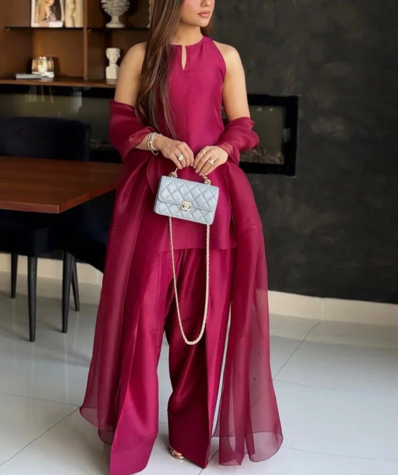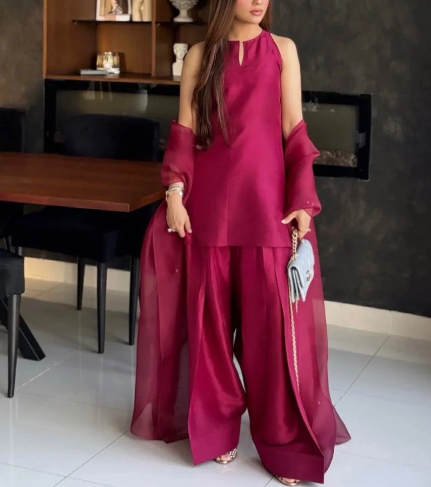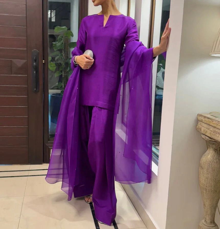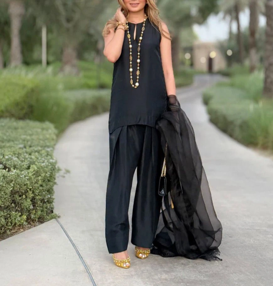 A statement of effortless elegance, this farshi set is designed for the modern muse who loves clean silhouettes with a hint of glam. Crafted in luxurious silk, the outfit features a sleek, straight-cut kameez with a minimal slit neckline, giving it a refined and contemporary look.