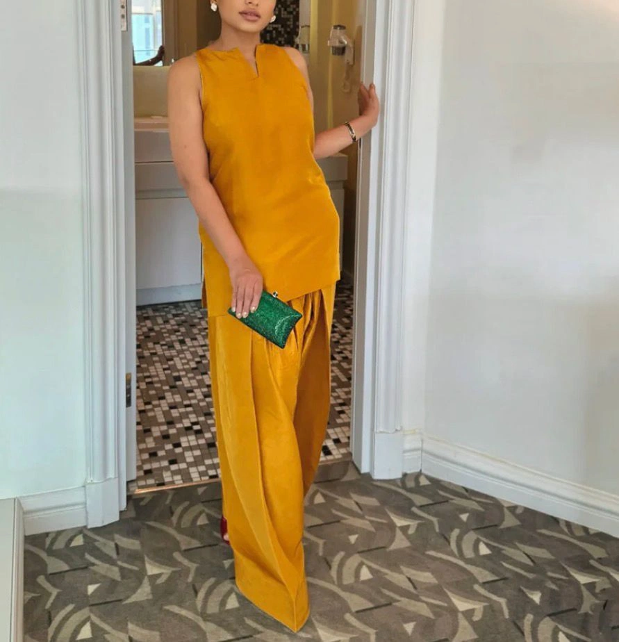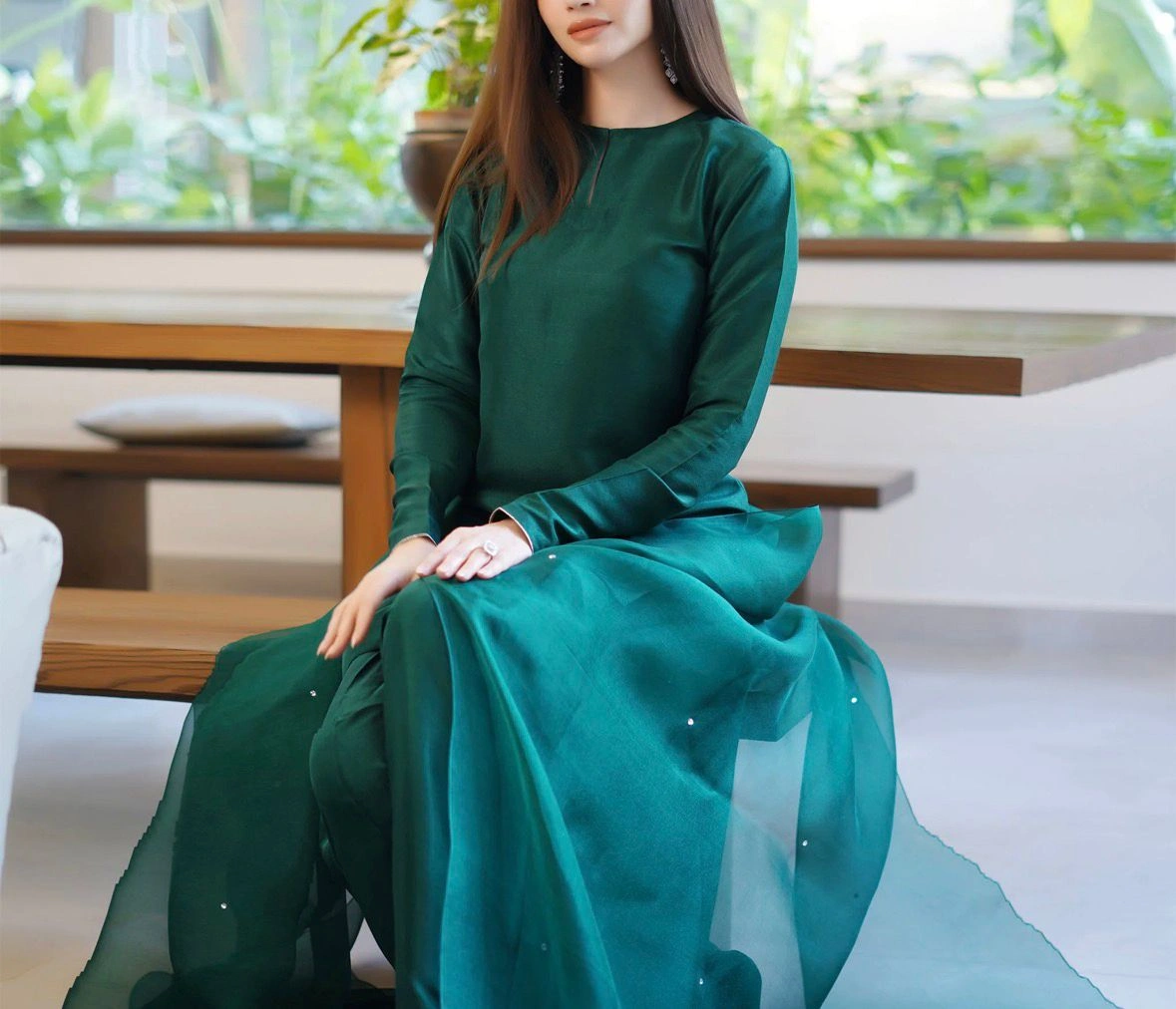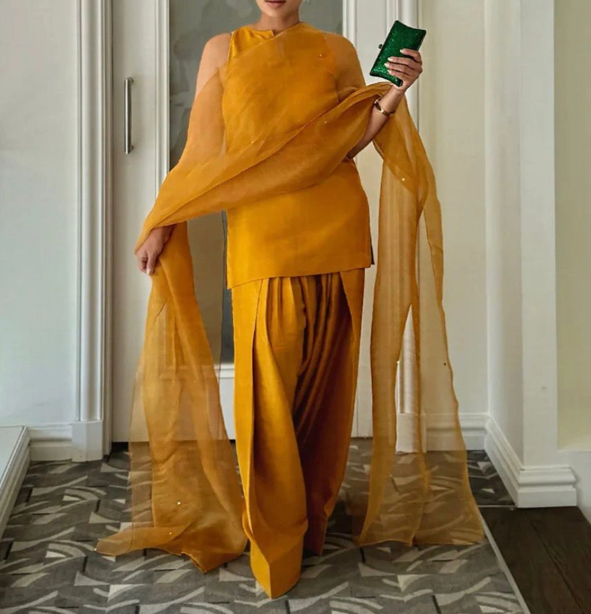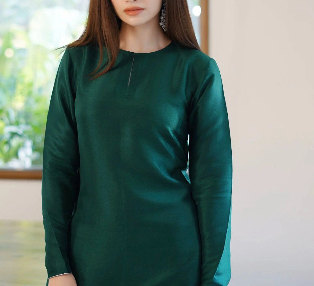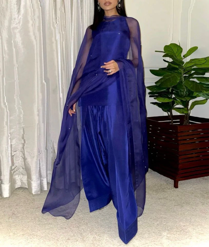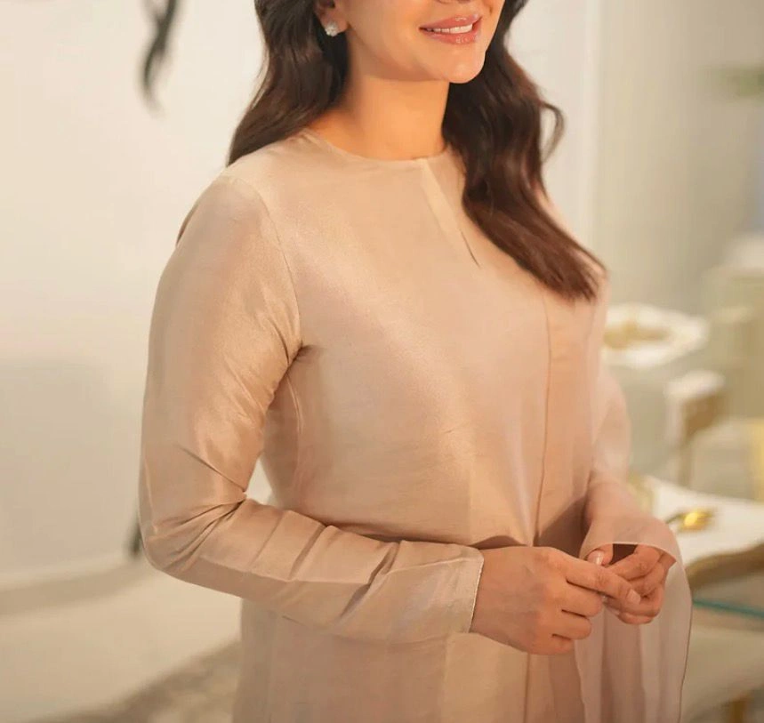 A statement of effortless elegance, this farshi set is designed for the modern muse who loves clean silhouettes with a hint of glam. Crafted in luxurious silk, the outfit features a sleek, straight-cut kameez with a minimal slit neckline, giving it a refined and contemporary look.