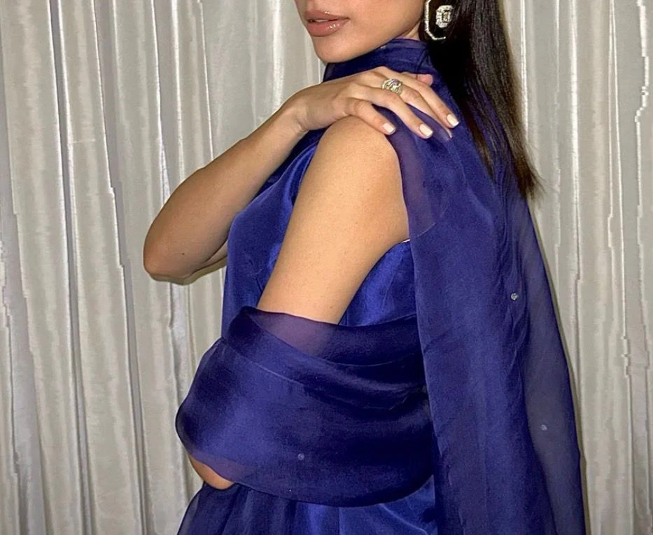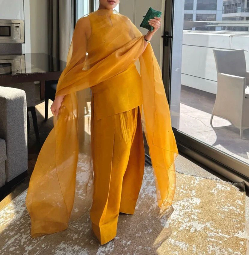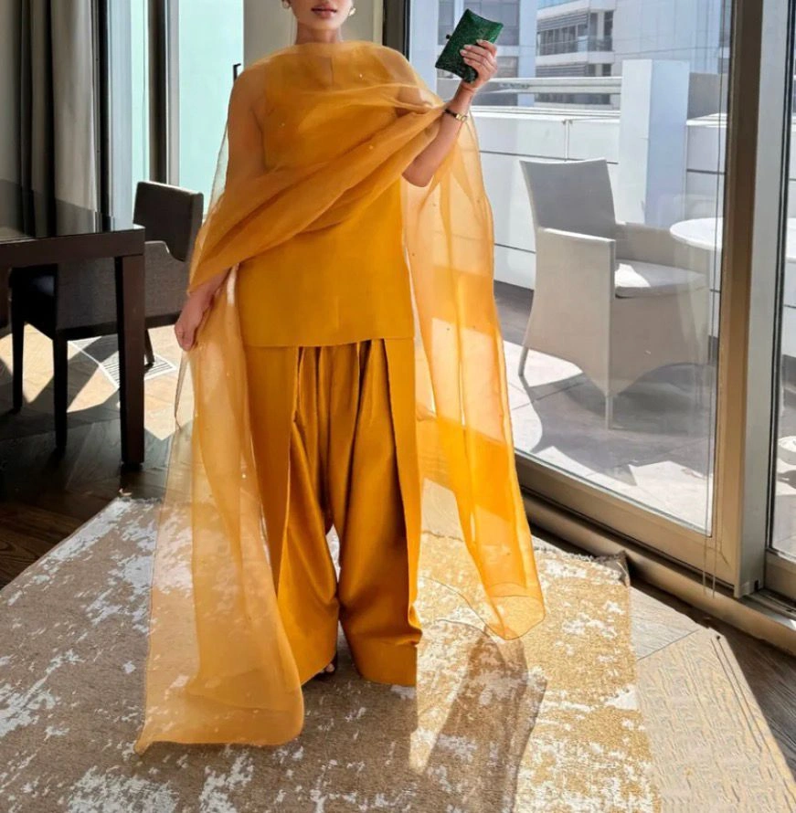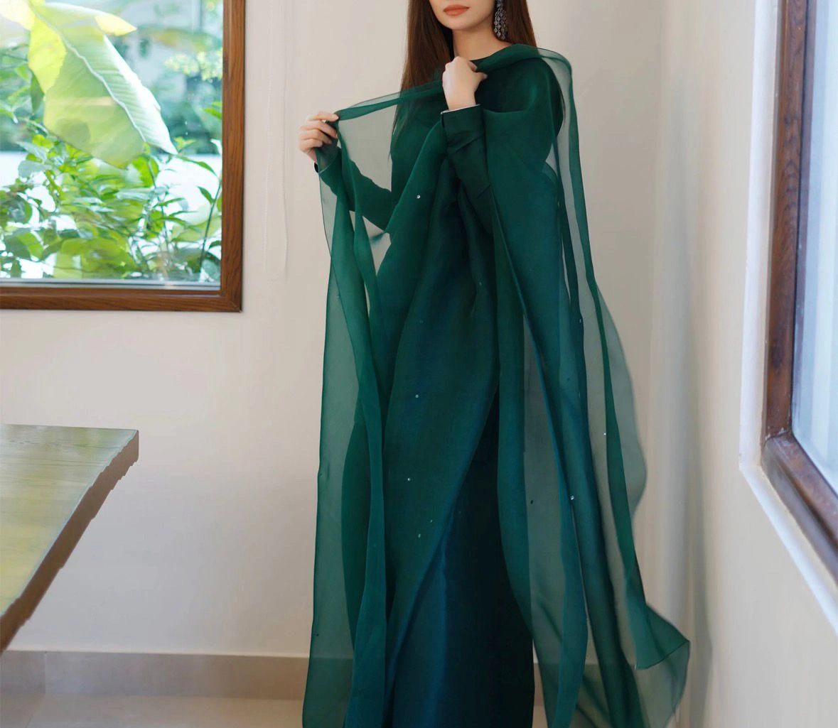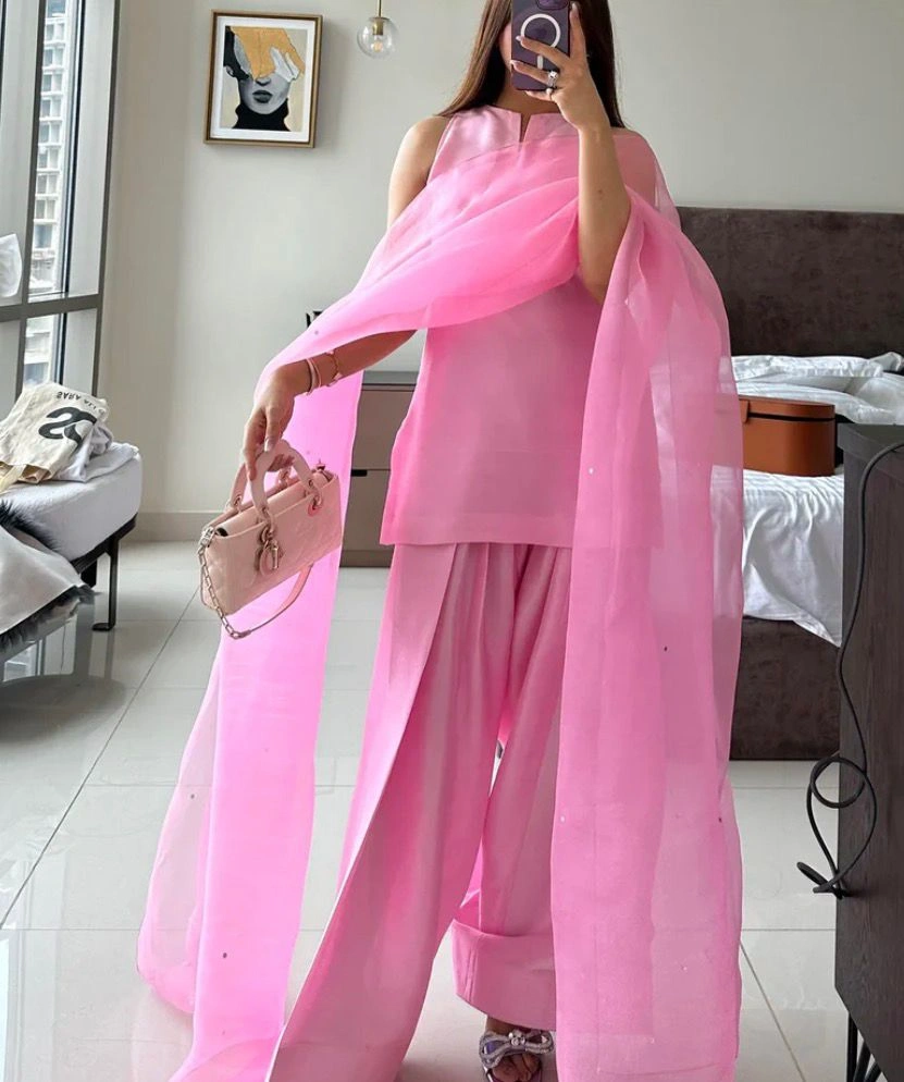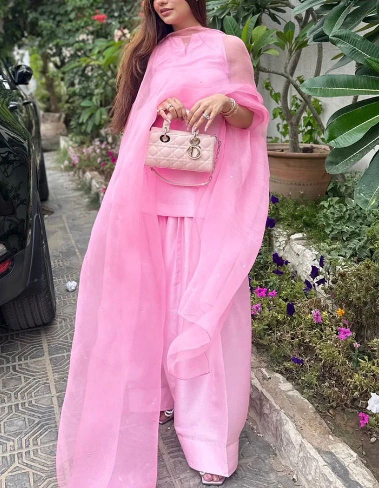 Paired with a flowy farshi bottom, it creates a graceful fall and elongates the overall silhouette. The organza dupatta is delicately adorned with tiny stone embellishments, adding a soft sparkle that elevates the entire ensemble.