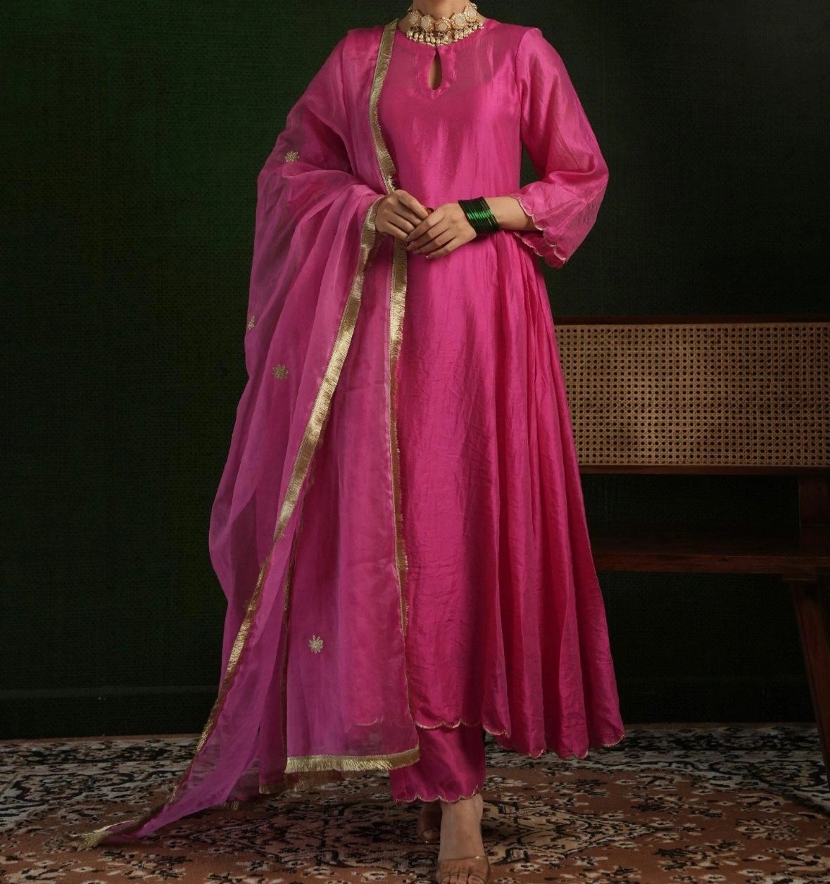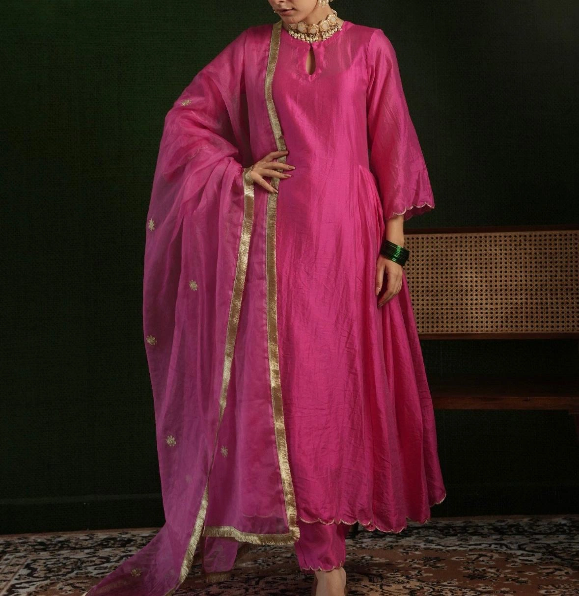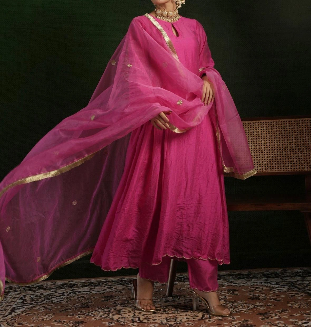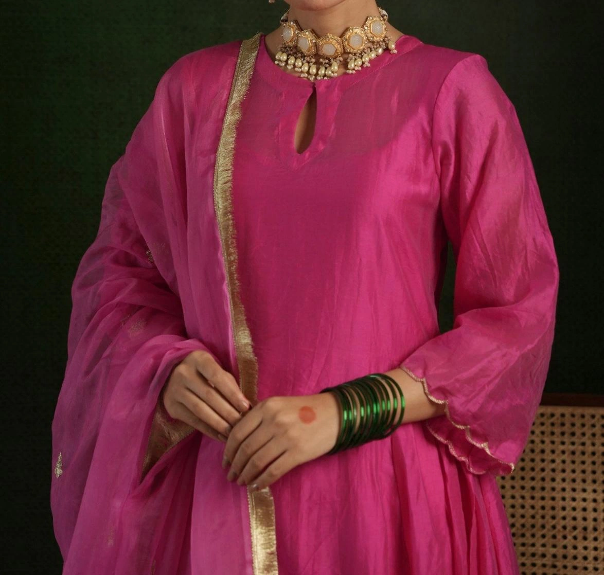 Step into effortless grace with this vibrant fuchsia pink Gulrukh Chanderi  Anarkali set, designed to blend traditional charm with modern finesse. From its elegant silhouette to the delicate Keyhole Neck, every detail adds a regal touch.
