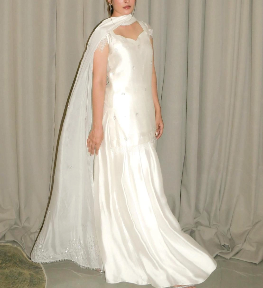 Grace meets minimal glamour in this serene white ensemble Mehnaaz – The Moonlit Outfit, crafted from luxurious butter silk fabric that drapes effortlessly. The short shirt features delicate crystal handwork scattered elegantly across the front, paired with a flowy plain plazo pant that adds subtle sophistication to the look. Completing the outfit is a soft, lightweight organza dupatta adorned with dainty handwork details, making it an ideal pick for intimate gatherings, festive evenings, or modern bridesmaid styling.