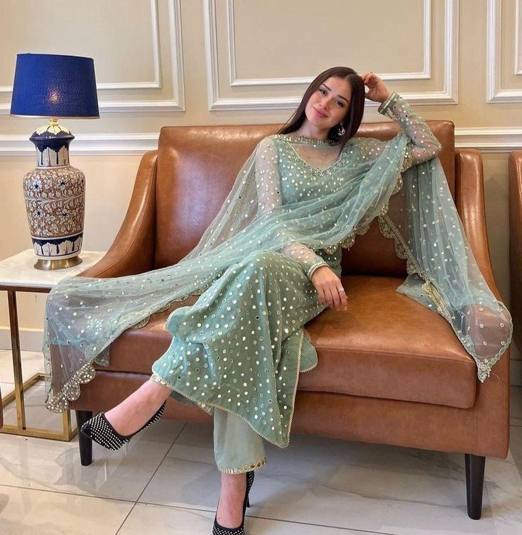 Shine with understated elegance in this Noor-e-JhilMil Mirror Work Outfit long top and trouser set, crafted on delicate net fabric for a dreamy, flowy silhouette. The kurta is adorned with intricate all-over mirror embellishments that sparkle with every movement, paired with straight trousers for a graceful finish. The soft net dupatta, detailed with matching mirror accents, completes this ethereal look. Perfect for festive gatherings, weddings, and evening soirées, this ensemble strikes the perfect balance between tradition and modern charm.