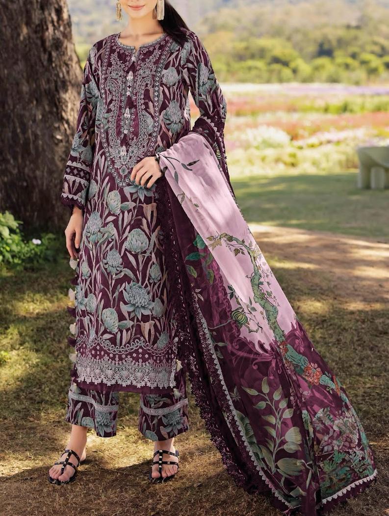 Rich plum tones meet intricate botanical patterns in this unstitched three-piece  Pakistani Lawn Suit. The digitally printed and delicately embroidered shirt is paired with coordinating printed trousers and a stunning bamber chiffon dupatta that features a soft blend of floral and vine motifs. Finished with elegant lace detailing, this ensemble is the perfect balance of bold and feminine.