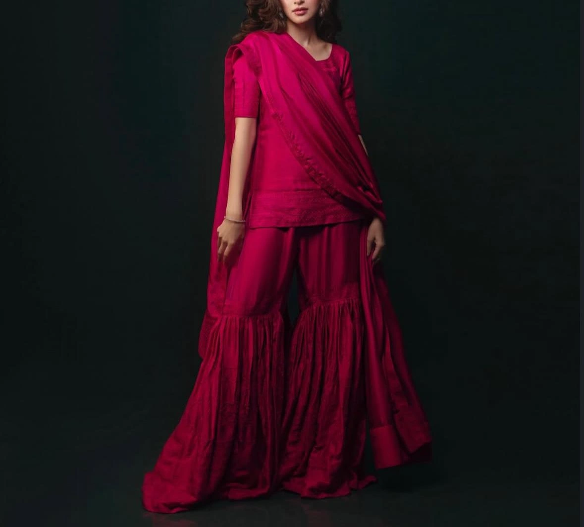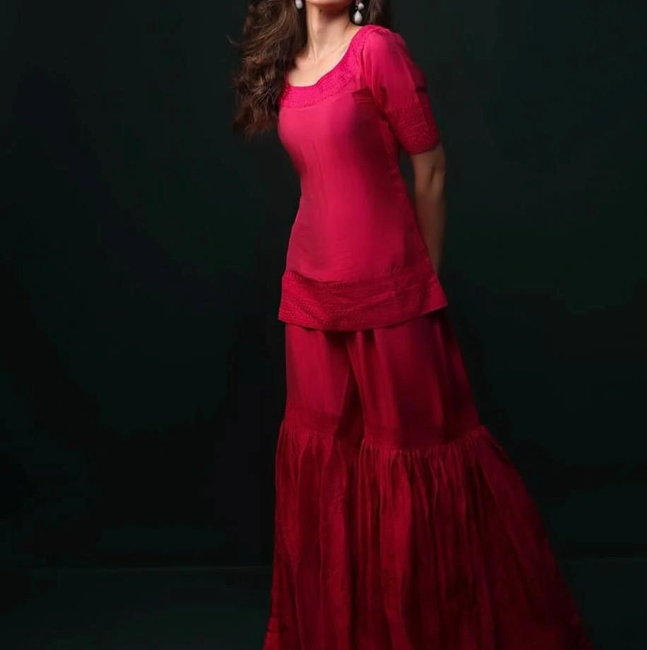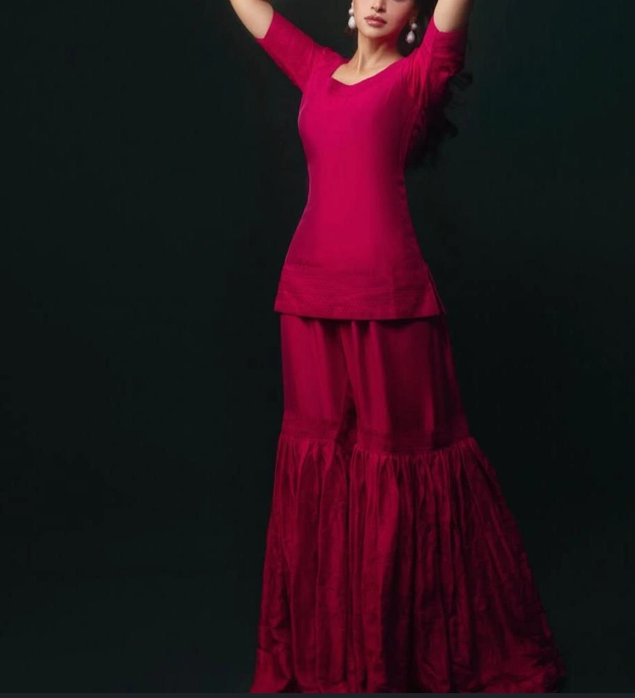 Gracefully bold and effortlessly regal — the Raani Rose Butter Silk Sharara Set is made for those who love to stand out with elegance. Crafted from ultra-soft butter silk, the ensemble features a straight-cut short kurta with elbow-length sleeves and delicate tone-on-tone detailing. The three-tier gathered sharara adds a dramatic flow, lending volume and flair with every step.