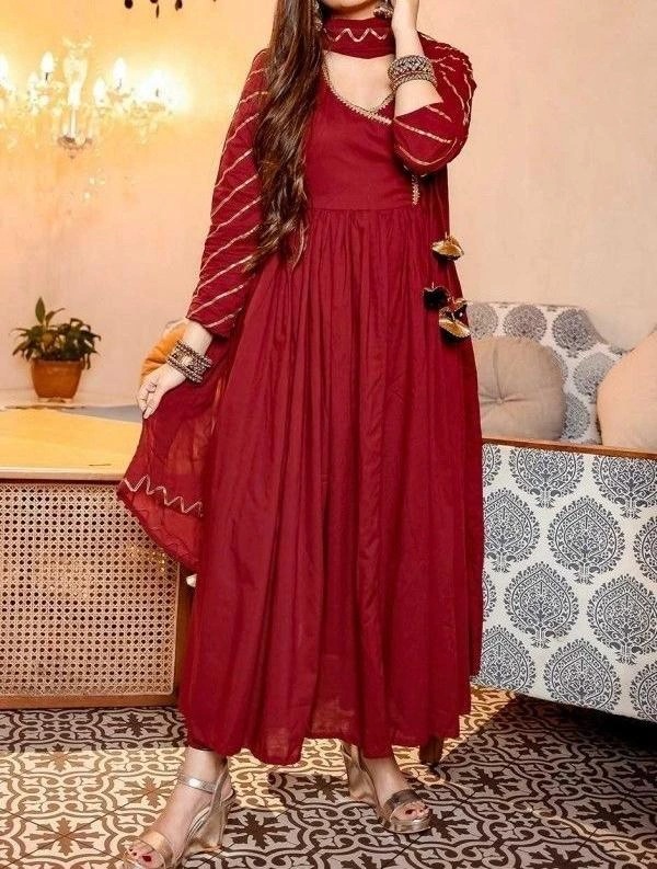 Step into timeless elegance with our Raqs-e-Laal Angrakha A line kurti , crafted in soft flowy fabric for a regal silhouette. The deep crimson hue is elevated with delicate gota detailing on the neckline, sleeves, and dupatta, giving it a rich festive charm. Paired with tassel accents and graceful fall,