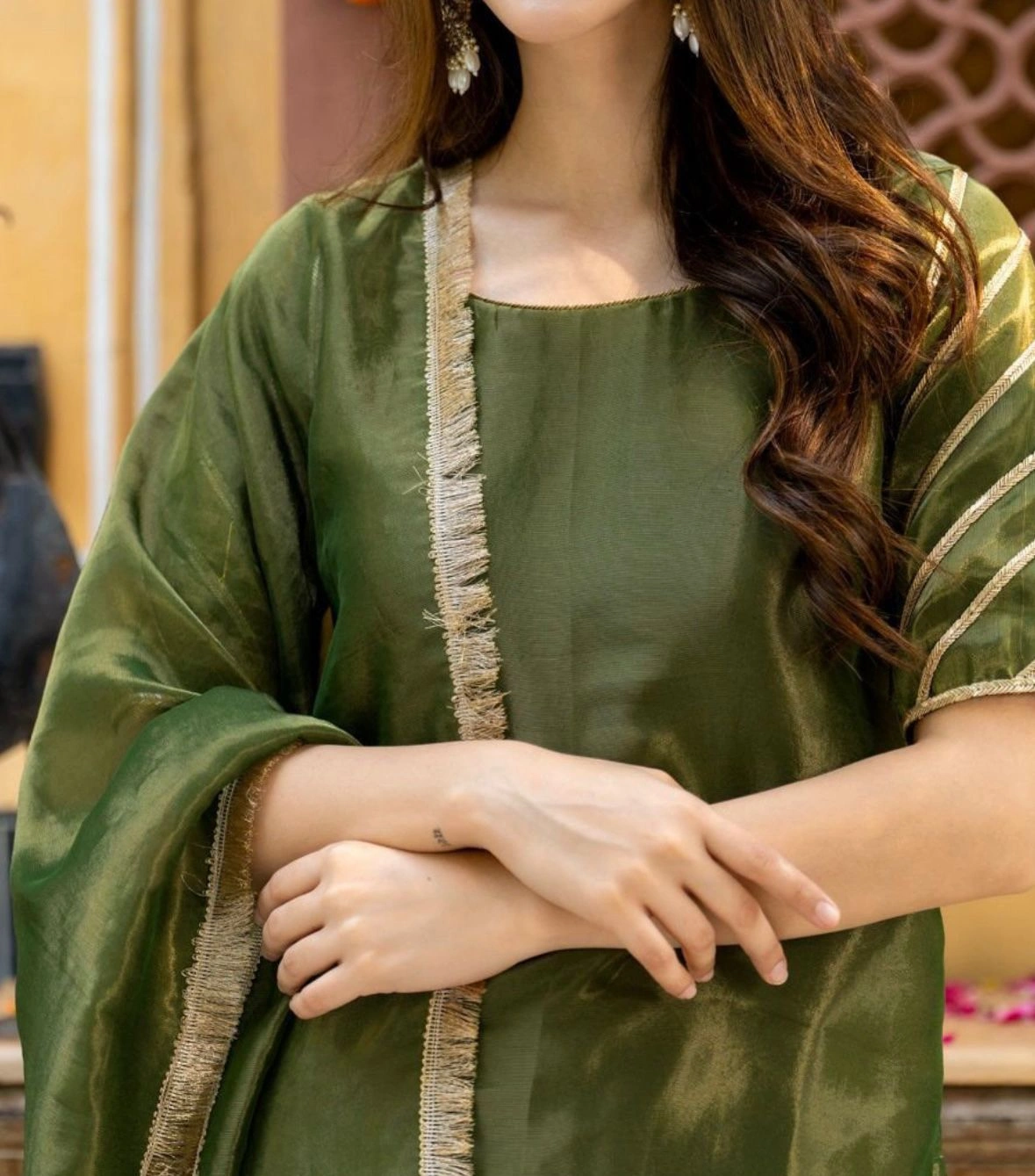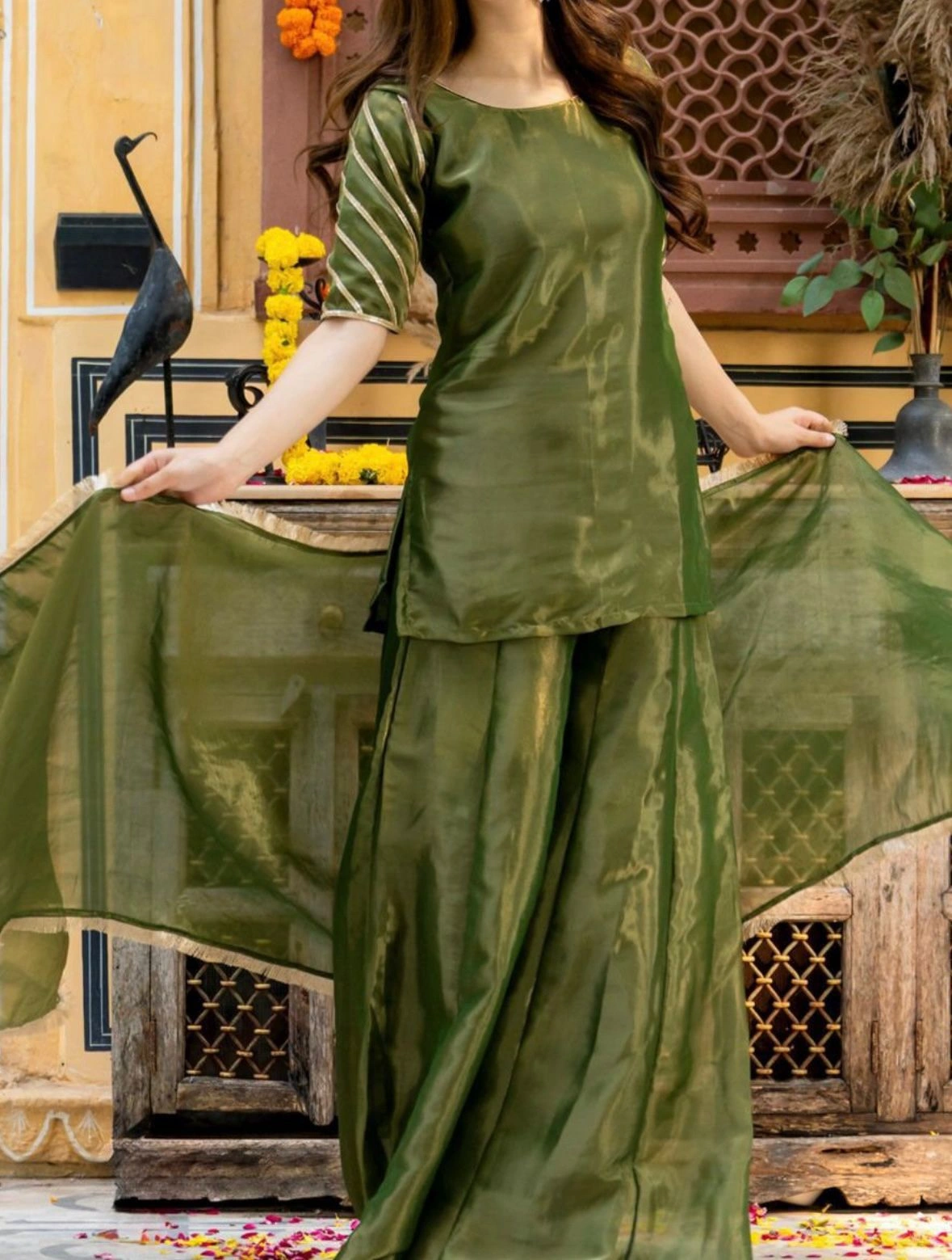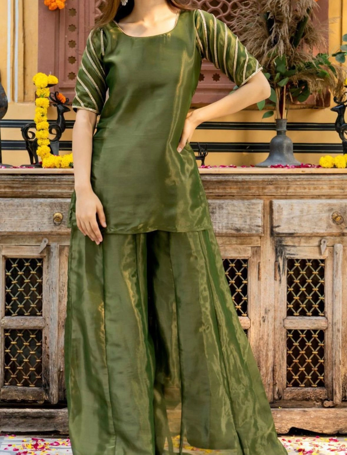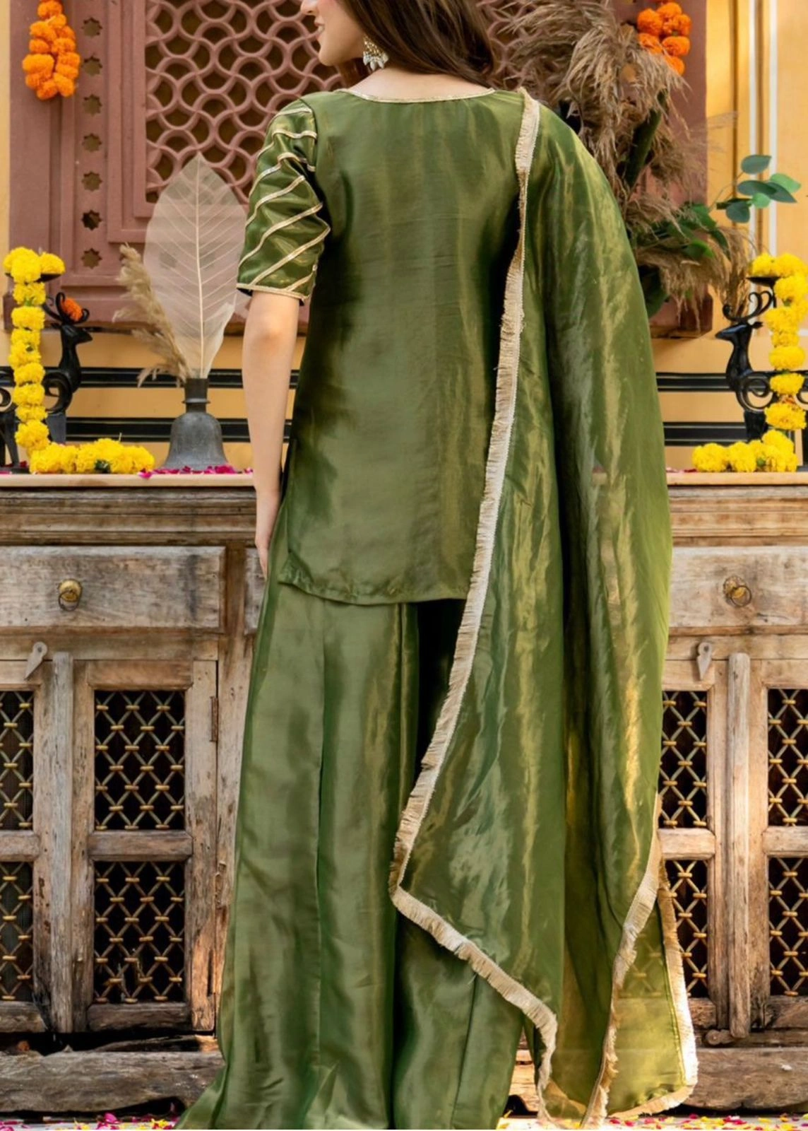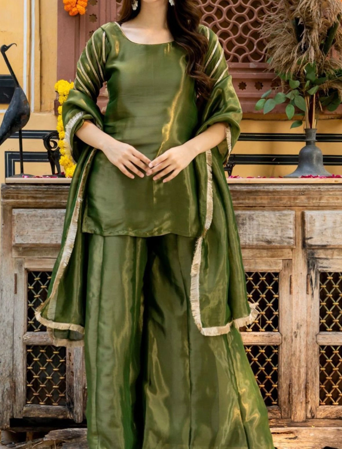 Grace meets grandeur in this beautifully crafted tissue fabric Sahiba sharara set. Featuring a soft olive green hue with a subtle sheen, this ensemble is perfect for festive occasions, intimate weddings, or cultural gatherings.