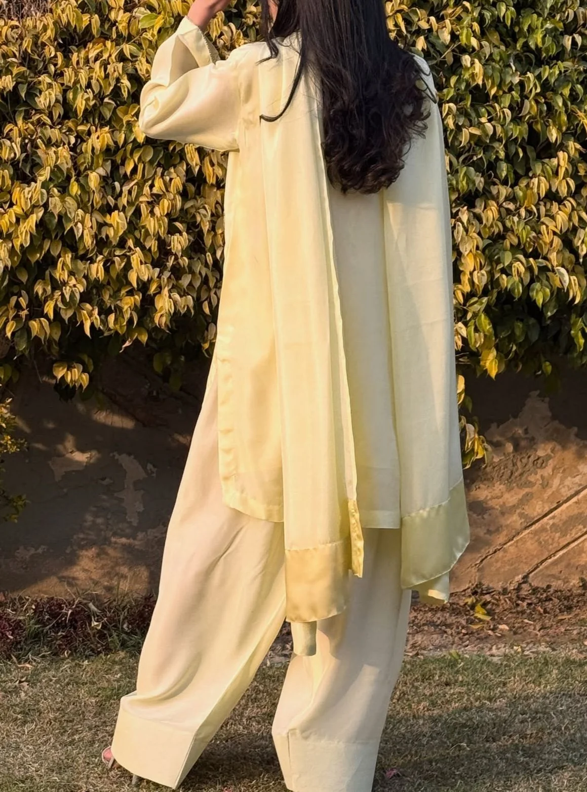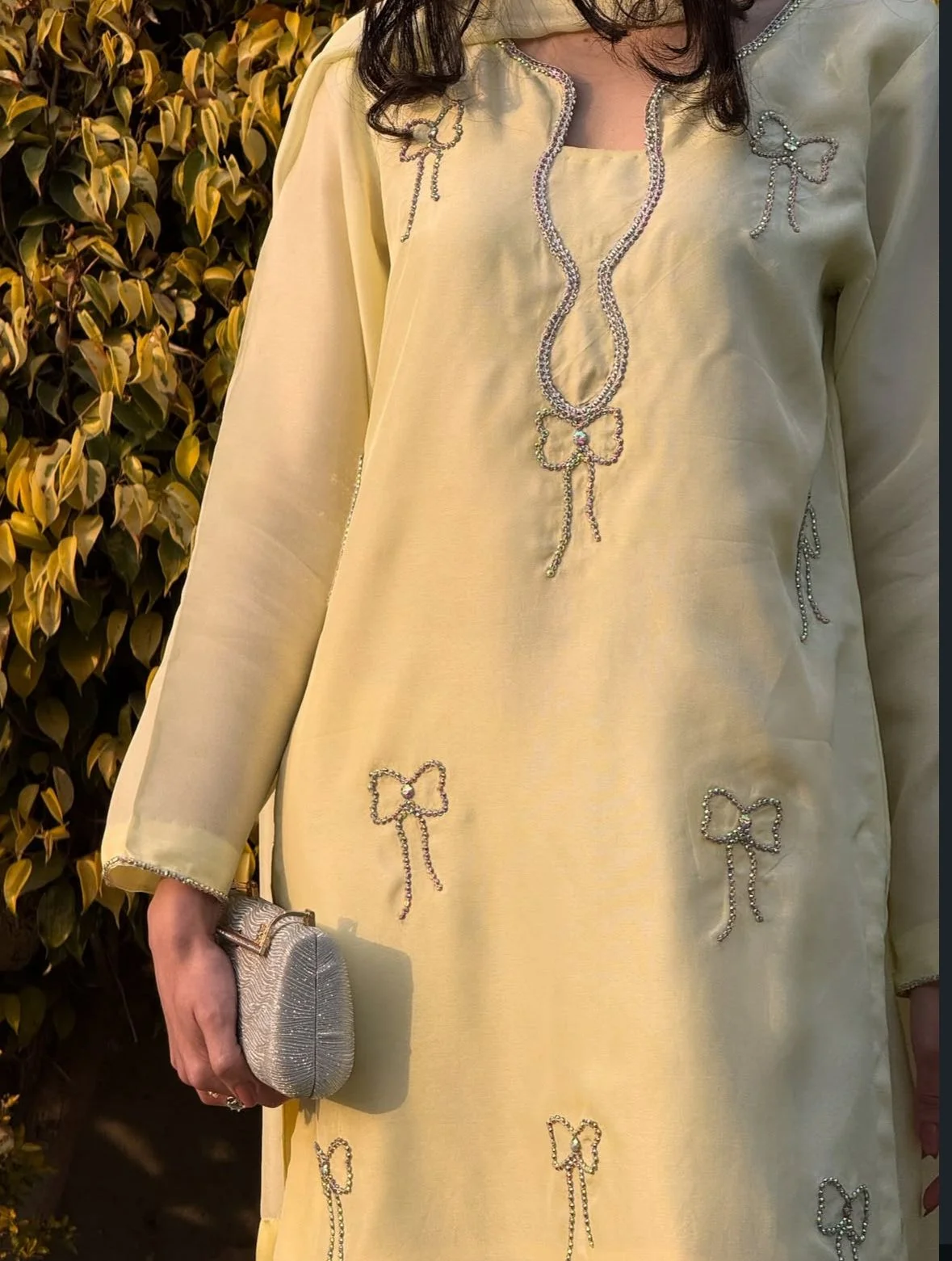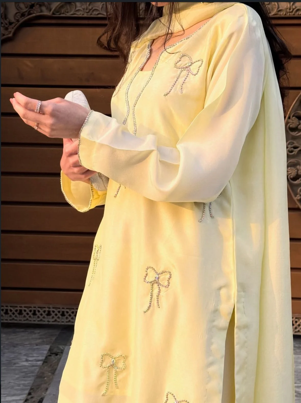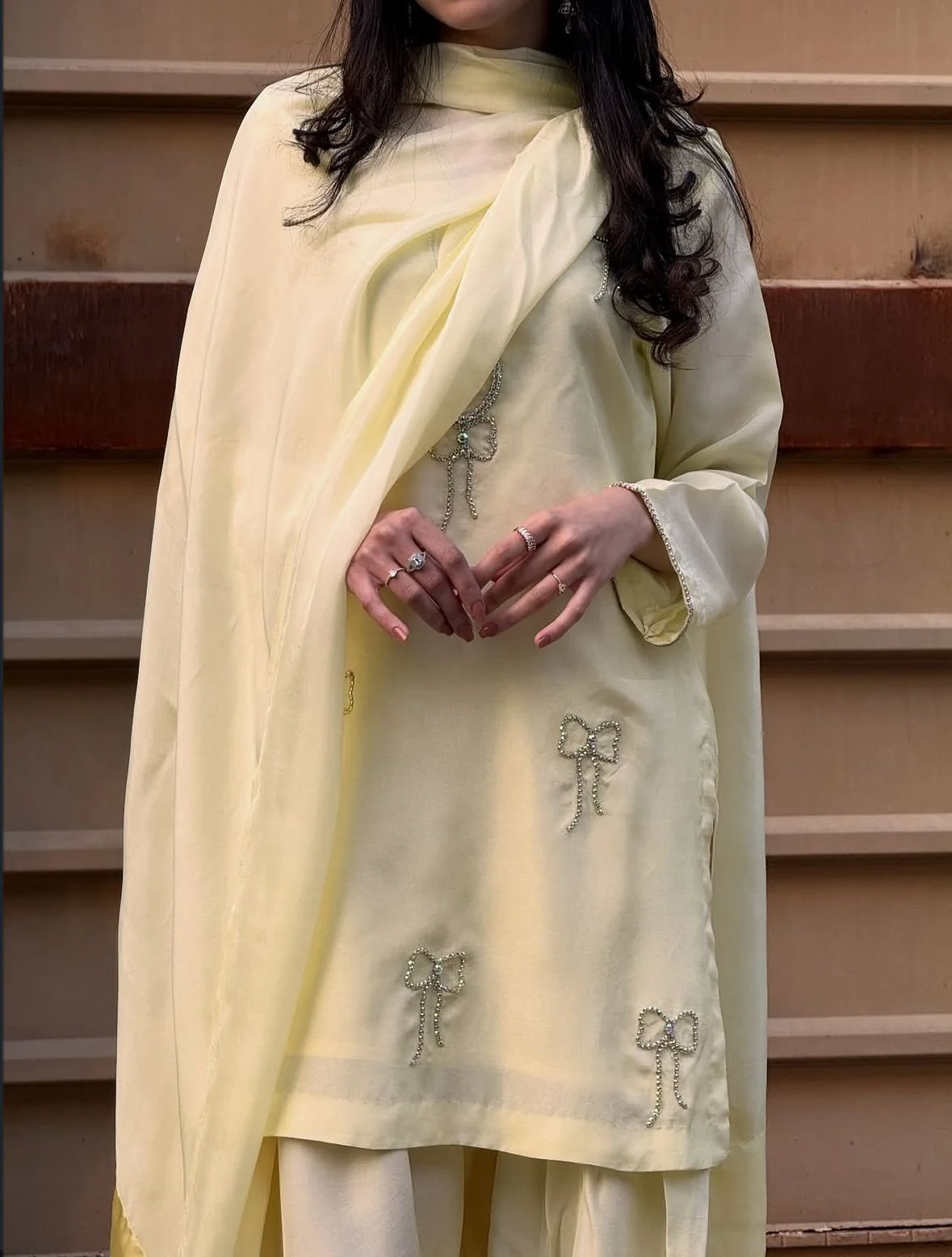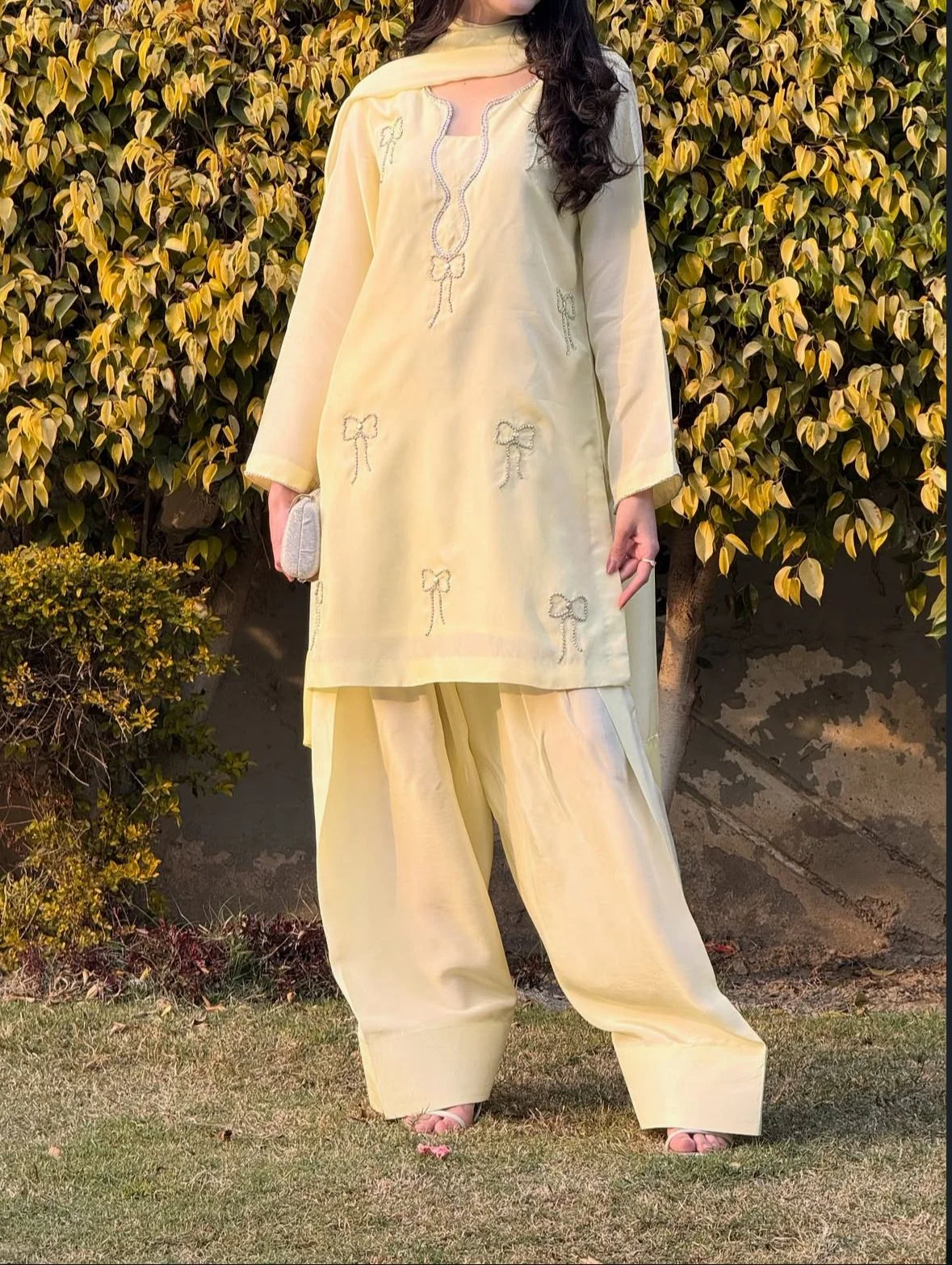 A soft and elegant ensemble crafted in premium sheesha silk, featuring a relaxed-fit kameez paired with a flowy farshi shalwar. The kameez is detailed with delicate handwork and rainbow crystal stone bow motifs, adding a subtle shimmer. Styled with a lightweight soft chiffon dupatta, this set is perfect for effortless day-to-evening wear